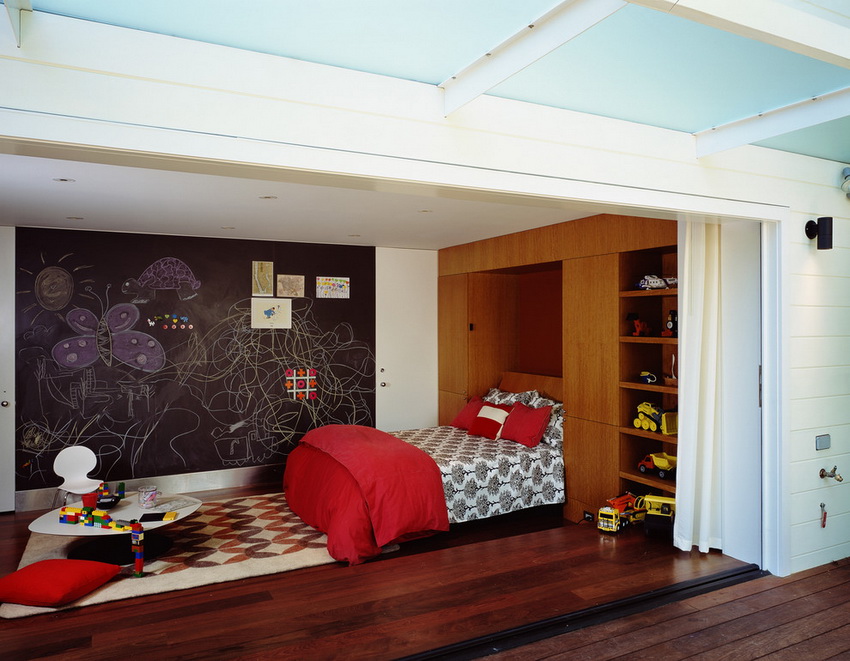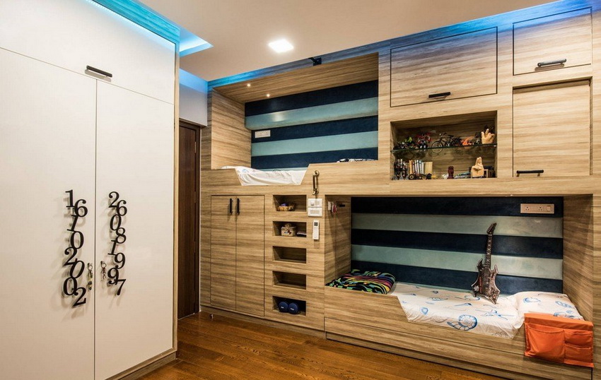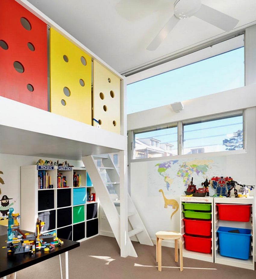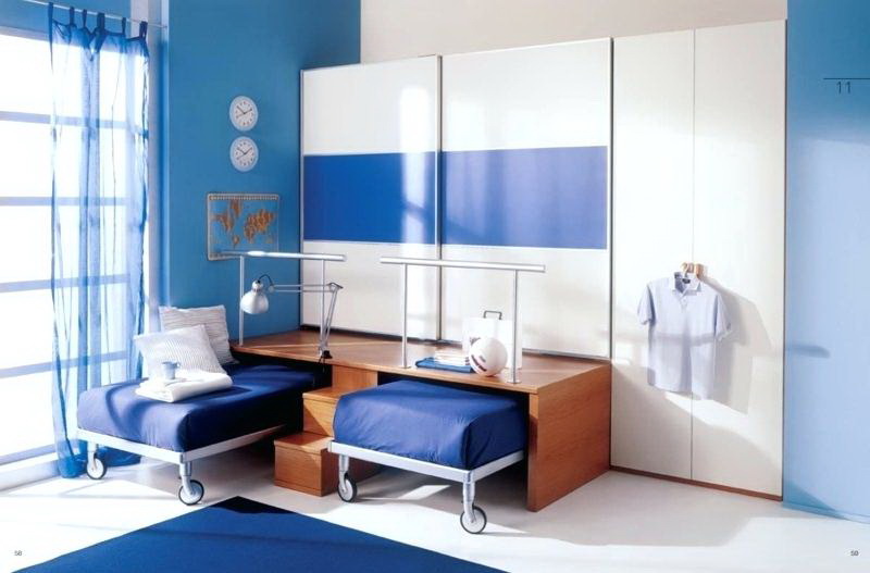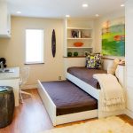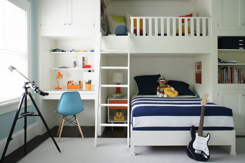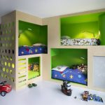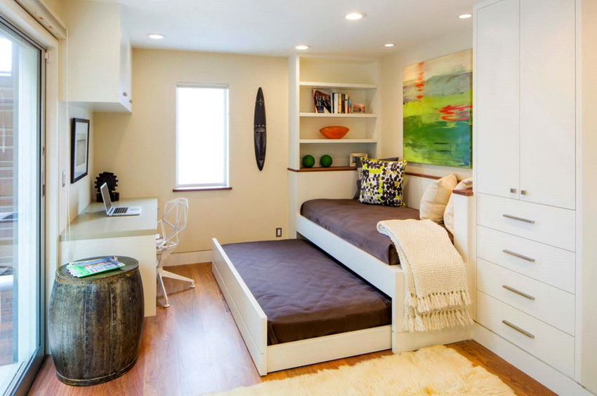 Hvis pladsen i børneværelset er meget begrænset, ville design i dette tilfælde med to udtrækssenge eller en køjeskift være en ideel løsning.