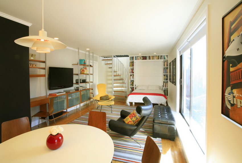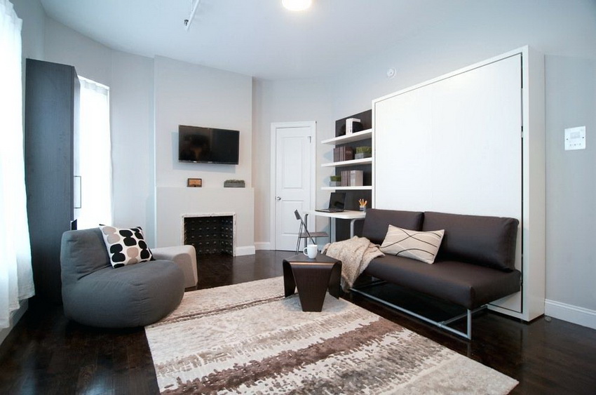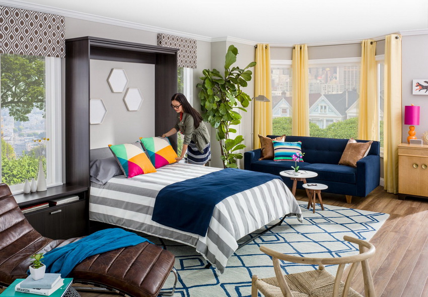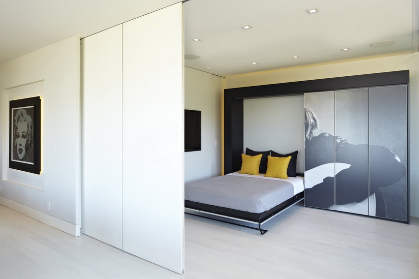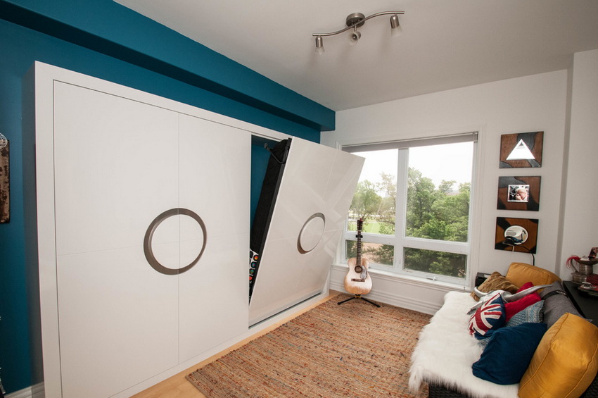 Garderobesenge i det indre af soveværelserne ser ganske interessante ud på billedet. De bruges i tilfælde, hvor opholdsrummet ikke har ledig plads til installation af en stationær struktur. Nogle gange kan konvertible senge ses i stuen. Hvis ejerne af lejligheden kan lide at modtage gæster, vil dette være en god løsning.
