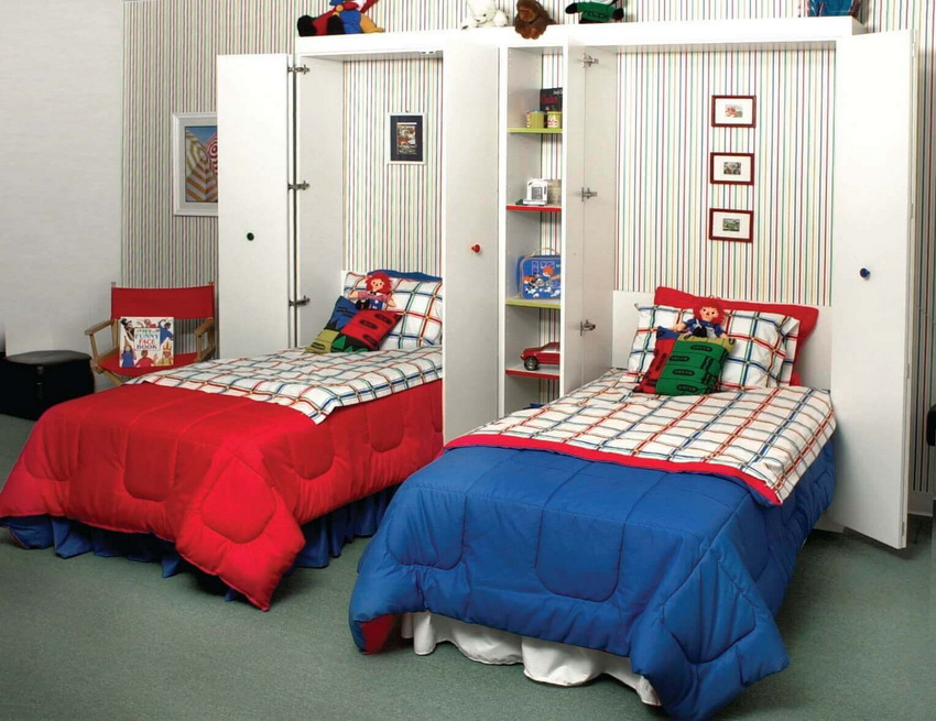 Der er også børneversioner af produkter, der har et passende design. Det sammenfoldelige design giver dig mulighed for at frigøre ekstra plads i soveværelset til legepladsen. Hvis der bor flere børn i lokalet, vil børnehaven være en nyttig erhvervelse køjeseng med garderobe, så du kan opnå dobbelt pladsbesparelser.