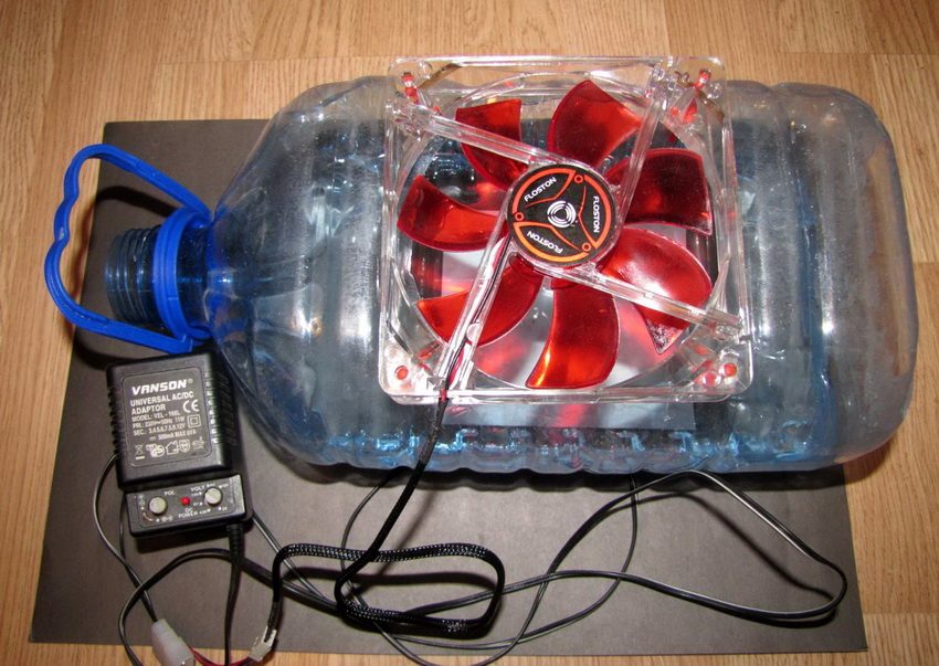 En akvariepumpe skal placeres i en almindelig 12 liter spand. Rørene, der kommer derfra, skal føres til toppen af netskovlene, og plastringen med huller skal installeres. En køler er monteret oven på den resulterende struktur for at tvinge luftstrømme inde.