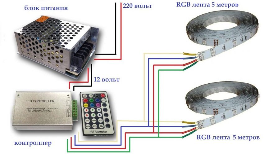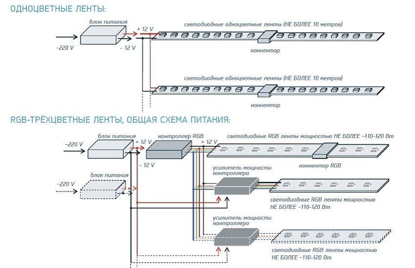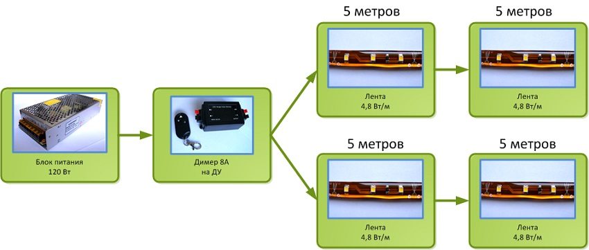 Das obige Beispiel eines Diagramms zum Anschließen eines LED-Streifens an ein Netzteil eignet sich für die Hintergrundbeleuchtung eines bis zu 5 m langen Streifens. Wenn Sie mehrere Klebebandstücke anschließen müssen, müssen Sie ein Parallelverbindungsschema verwenden.