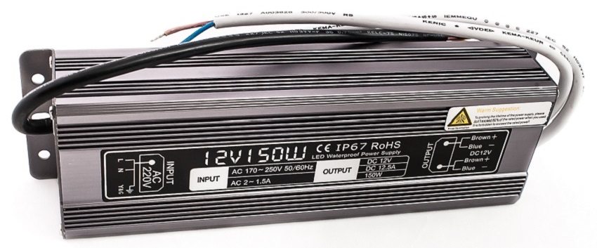 Bei der Berechnung der Leistung des Netzteils für den LED-Streifen multiplizieren wir die Spannung und den resultierenden Stromwert: 12Vx9A = 108 W. Daher ist ein Stabilisator mit einer Leistung von mindestens 108 W akzeptabel. Es ist jedoch zu beachten, dass das Gerät mit einer Gangreserve von 20 Prozent ausgewählt wurde, da es sonst schnell durch Überlastung ausfällt. Dies bedeutet, dass die erforderliche Leistung 108x1,2 = 129,6 W beträgt, d. H. In diesem Fall ist die Wahl eines Netzteils für einen 12-V-LED-Streifen - 150 W optimal.