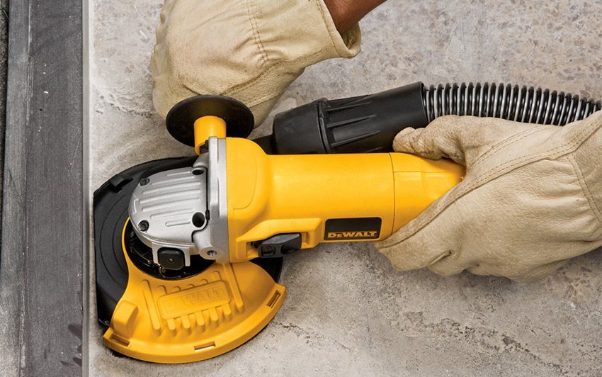 Vor Arbeitsbeginn muss der Schleiferaufsatz für den Staubsauger am Winkelschleifer befestigt werden. Daran ist ein Rohr befestigt, das zum Entfernen von Staub und größeren Partikeln erforderlich ist. Während der Arbeit muss das Werkzeug festgehalten werden, damit die Scheiben nicht abspringen.
