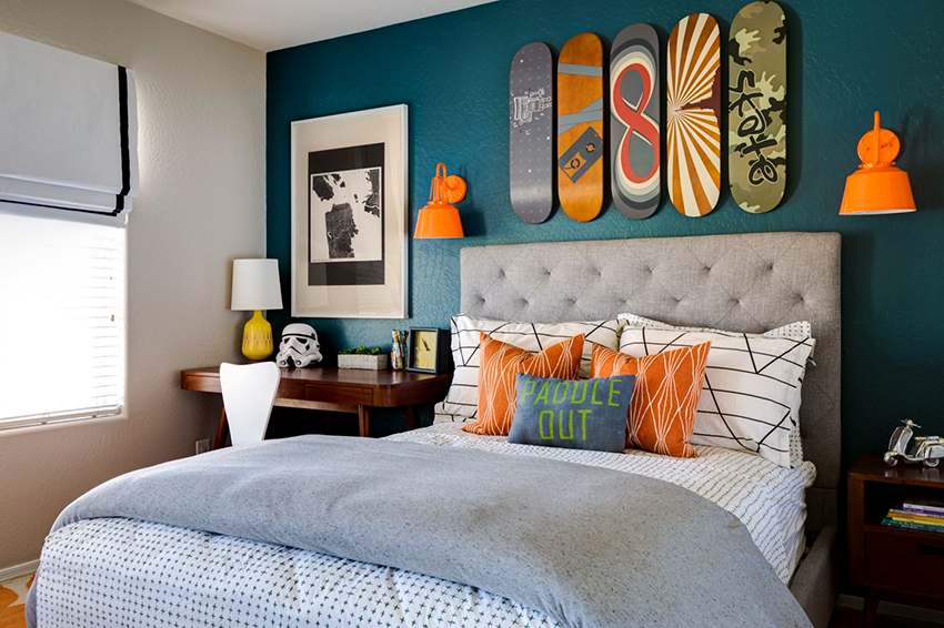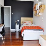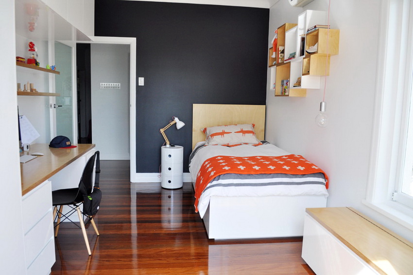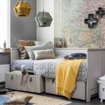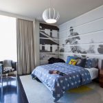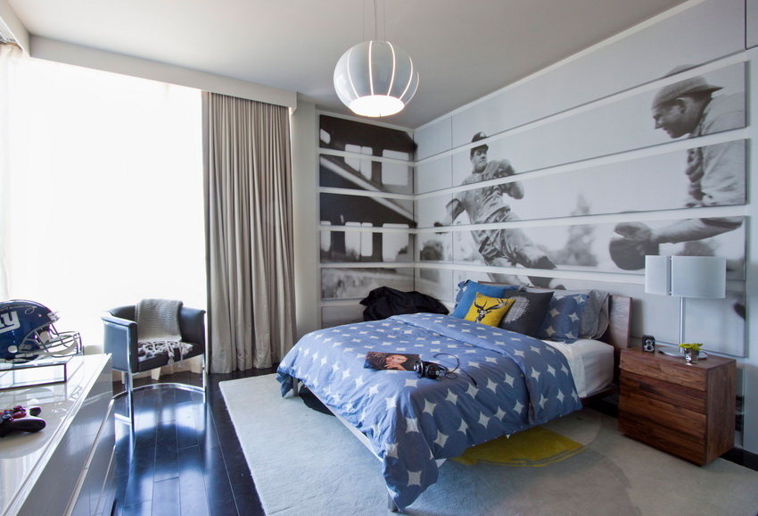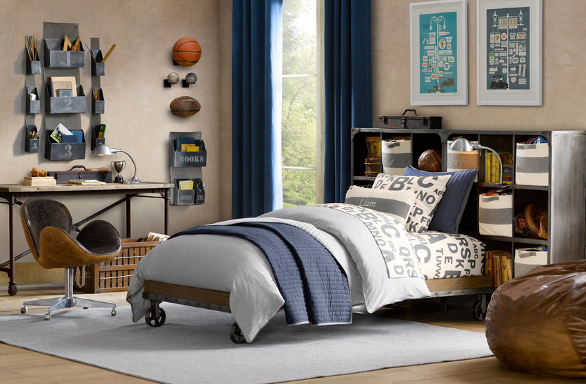 Das Zimmer eines Teenagers zeichnet sich durch Zurückhaltung und Minimalismus aus. Der Liegeplatz sollte ein einfaches, herausragendes Design mit einer guten orthopädischen Matratze sein. Eine gute Option ist das Schlafsofa des Jungen, das tagsüber als Empfangsbereich genutzt werden kann. Eine ebenso interessante Lösung wird ein mobiles Möbelset sein, dessen Elemente nach den Grundpräferenzen des Kindes angeordnet werden können.