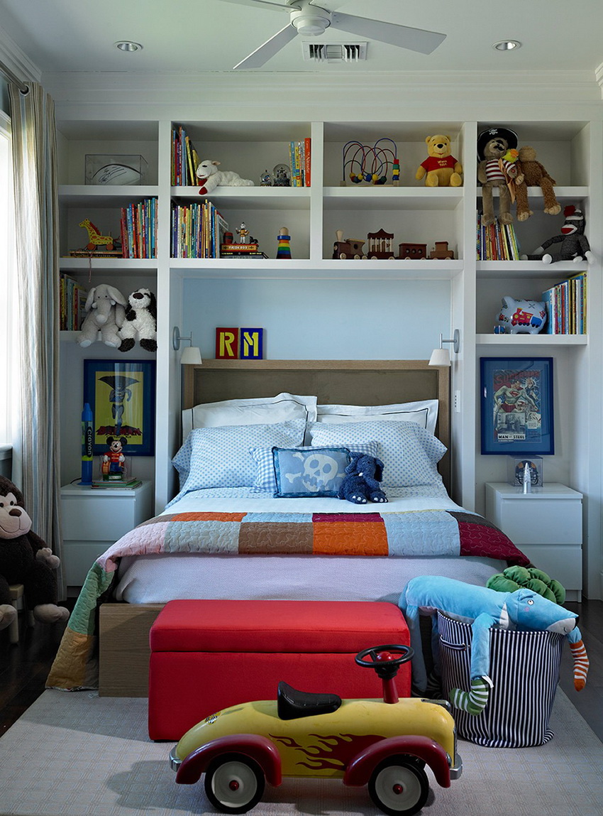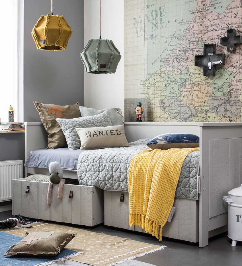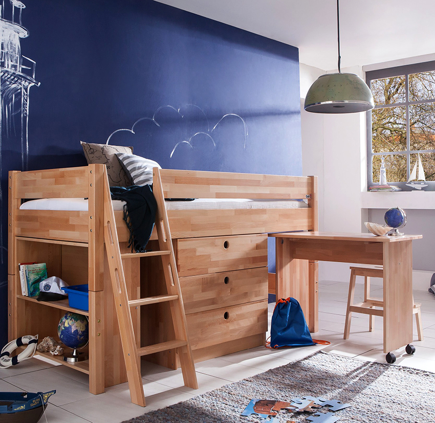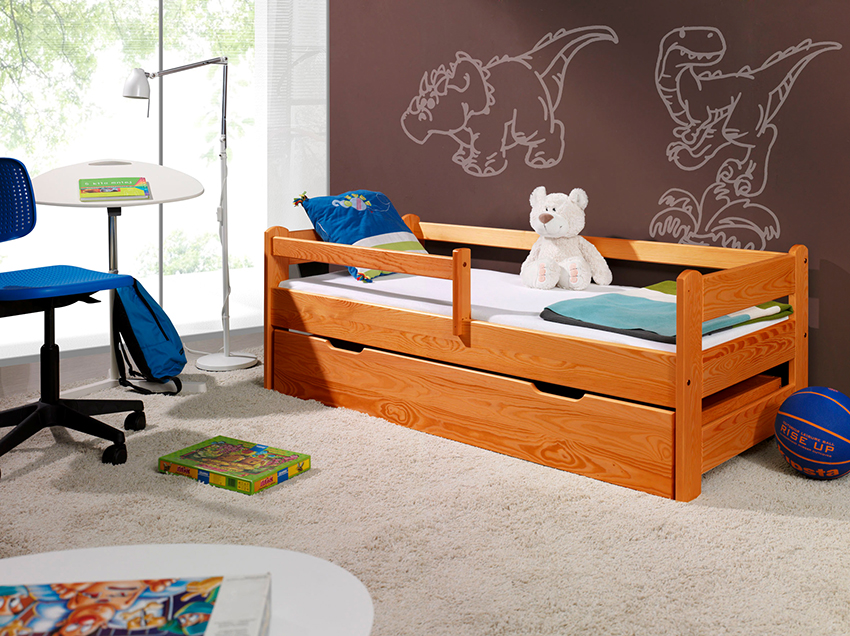 Für einen Jungen über 7 Jahre ist ein mit Schubladen ausgestattetes Bett geeignet, in das er seine Sachen stellen kann