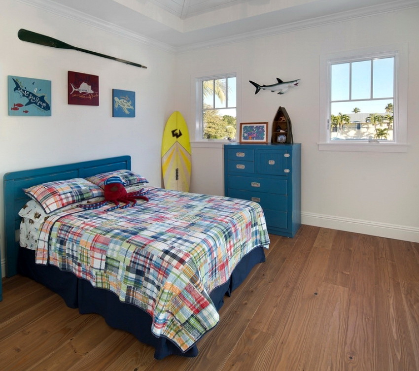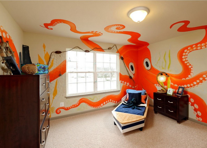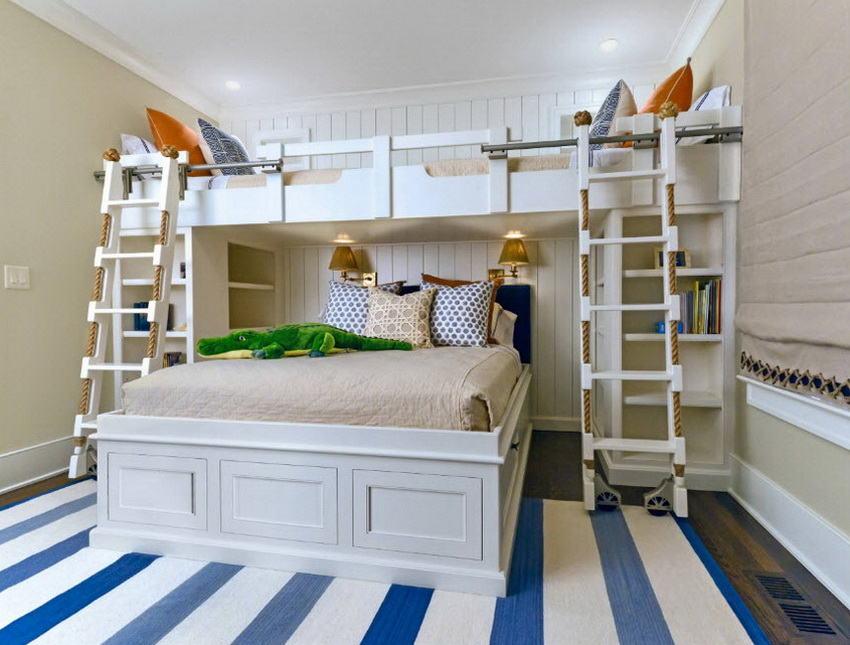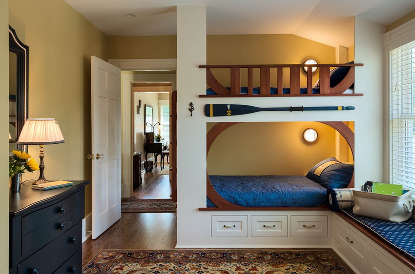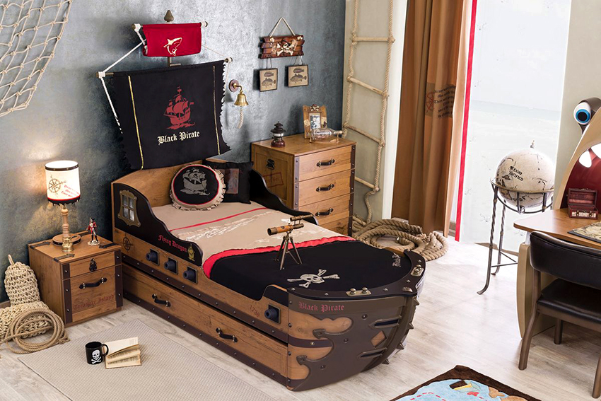 Modelle, die den Wassertransport imitieren, sind nicht ohne Beliebtheit. Die Betten können in Form von Fischerbooten oder Seeschiffen hergestellt werden. Oft verwenden solche Designs ein Angelthema. Teure Gegenstände sind mit Holzmasten, Kanonen und anderen charakteristischen Marineattributen ausgestattet. Etagenbetten für zwei Jungen sind mit einer Strickleiter ausgestattet. Aufbewahrungsboxen können im Aussehen Truhen ähneln. Es ist ratsam, Segel aus einem Baldachin zu machen. Kindermöbel im Marine-Stil sind in den Farben Blau, Grün, Braun und Hellblau erhältlich.