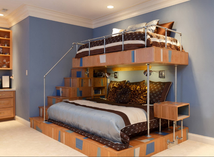 Für zwei Brüder wird ein zweistufiges Design als die akzeptabelste Option angesehen. Der obere Liegeplatz muss unbedingt mit einer Schutzkante ausgestattet sein. Ein älteres Kind kann hier schlafen.