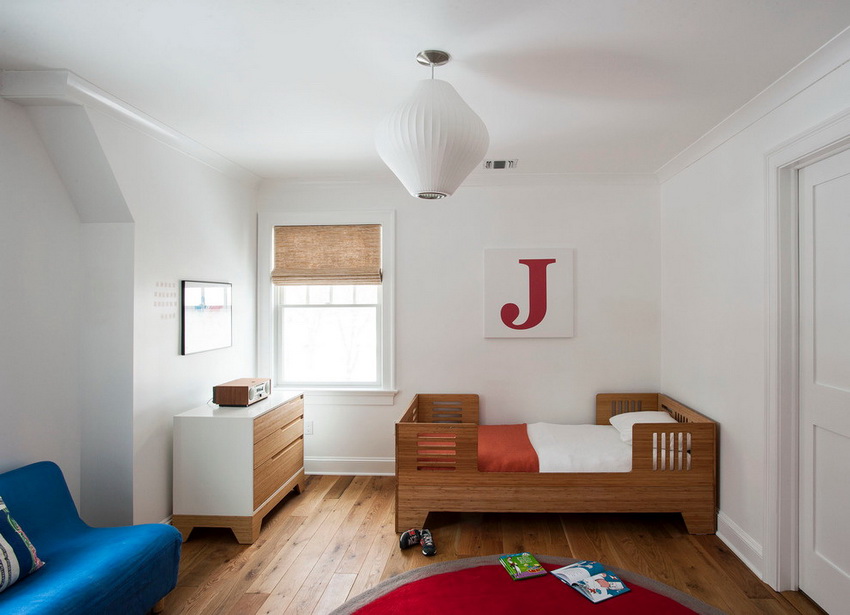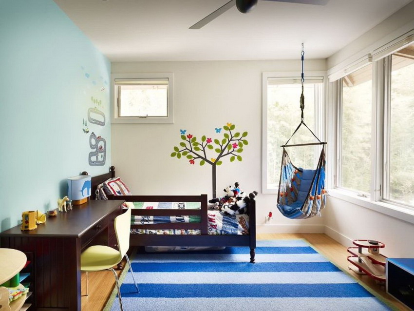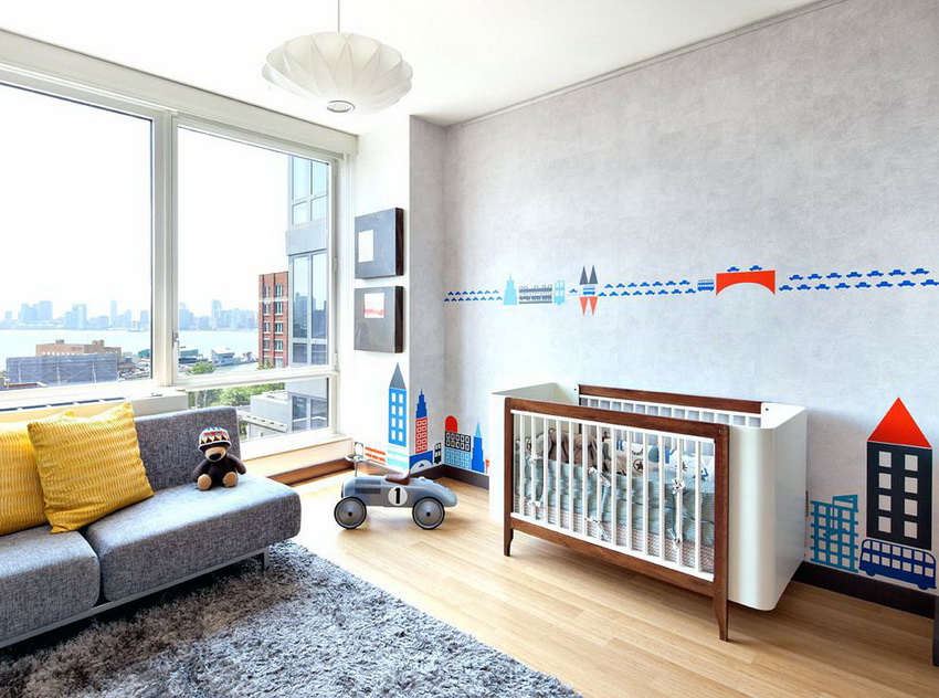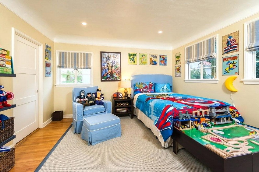 Das Innere eines Kinderzimmers für einen Jungen von 1 bis 3 Jahren zeichnet sich durch helle Farben, sichere und geschützte Möbel, einen großen Raum für Spiele, Komfort und Bequemlichkeit aus. Der Raum sollte nicht mit unnötigen Möbeln und anderem Zubehör überladen werden. Das Kinderbett eines Jungen muss Sicherheitsvorkehrungen für einen sicheren Betrieb haben. Die Möbel bestehen ausschließlich aus Naturholz ohne Verwendung von Lack- und Farbmassen.