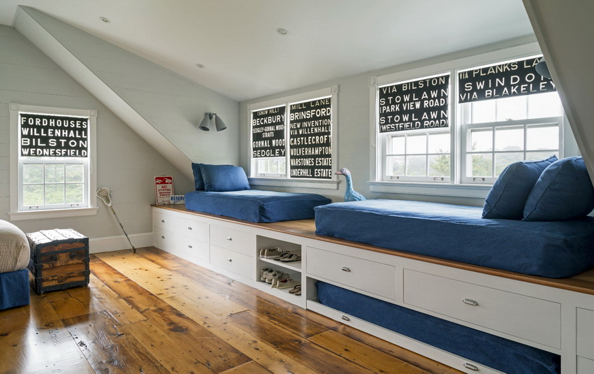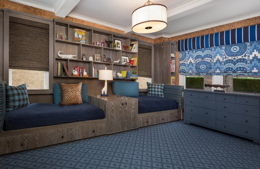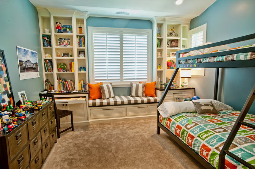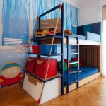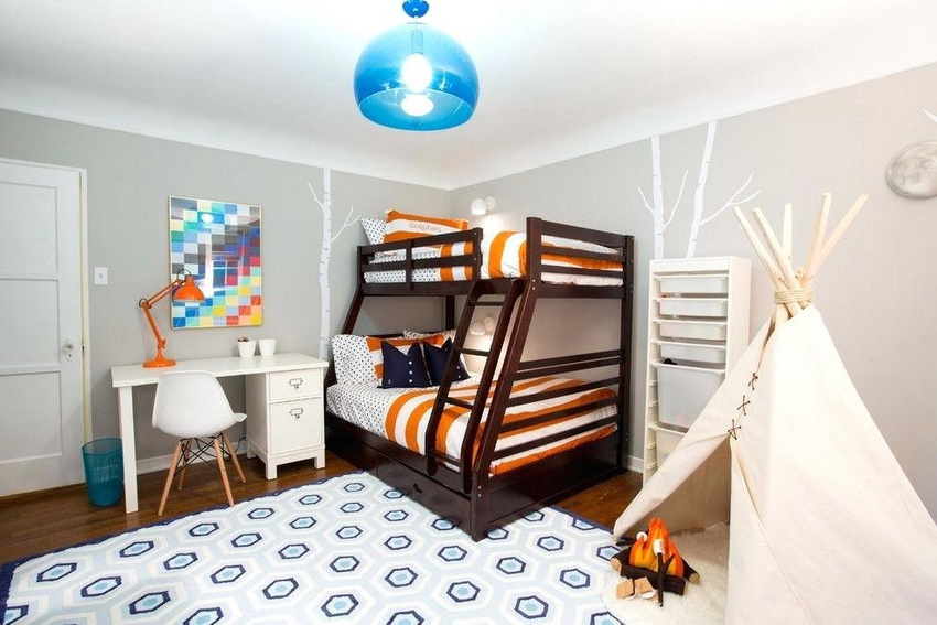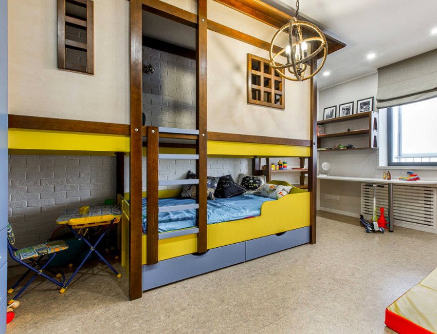 Im Raum sollte genügend Platz für die aktiven Spiele des Kindes vorhanden sein. Für zwei Kinder sind Etagenbetten mit Schubladen und Regalen zur Aufbewahrung von Spielzeug und Gegenständen die beliebteste Option. Solche Strukturen nehmen ein Minimum an Platz ein, zeichnen sich jedoch durch große Kapazität und Funktionalität aus.