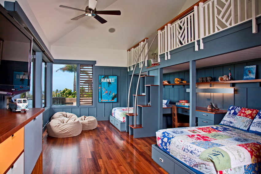 Hilfreicher Rat! Mit Hilfe zusätzlicher Geräte kann eine solche Struktur in ein Haus, ein Zelt, ein Zelt, einen Bus, ein Piratenschiff oder eine Raumstation verwandelt werden, was auf dem Foto von Etagenbetten für Jungen deutlich zu sehen ist.