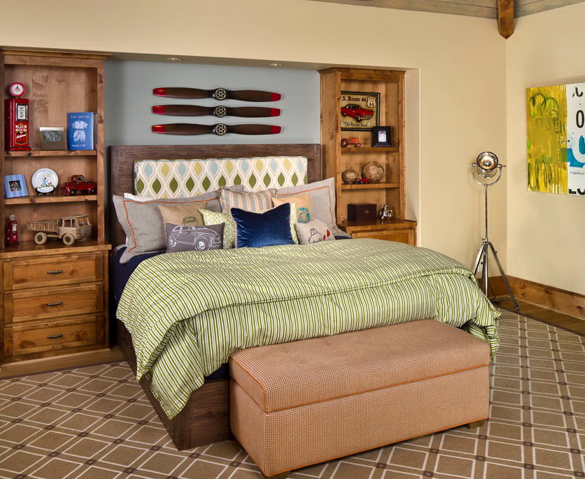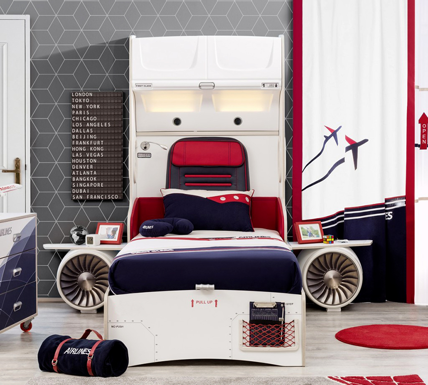 Eine sehr interessante Option für einen Jungen ist ein Flugzeugbett, das wie ein realistisches Modell eines Flugzeugs aussieht oder mit Stoßstangen ausgestattet ist, die der Form eines Passagierflugzeugs ähneln. Alle Komponenten des Produkts weisen keine scharfen Ecken auf, wodurch die Wahrscheinlichkeit von Verletzungen ausgeschlossen ist. Solche Produkte zeichnen sich nicht nur durch ihr stilvolles und originelles Design aus, sondern auch durch eine hohe Funktionalität, die sich in einer Vielzahl von Regalen und Schränken im Möbeldesign äußert.