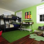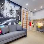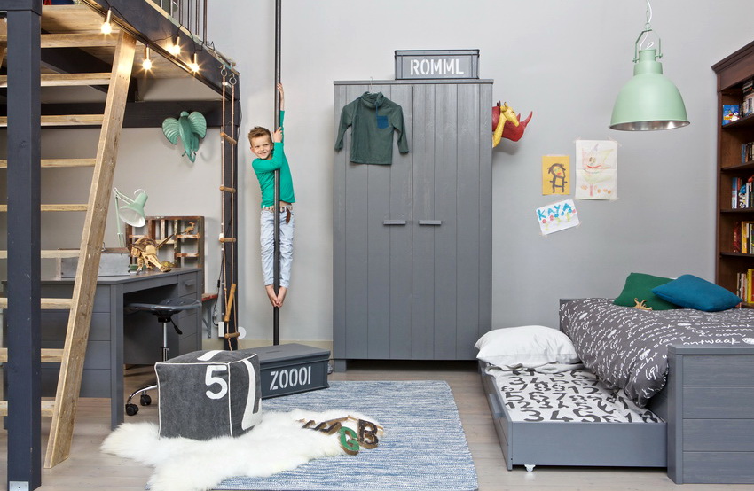 Bei Jungen im Grundschulalter sollte der körperlichen Aktivität große Aufmerksamkeit gewidmet werden. Daher ist es wichtig, im Kinderzimmer einen Sportbereich einzurichten, der Teil eines Etagenbettes aus Eisen sein kann.