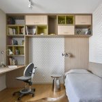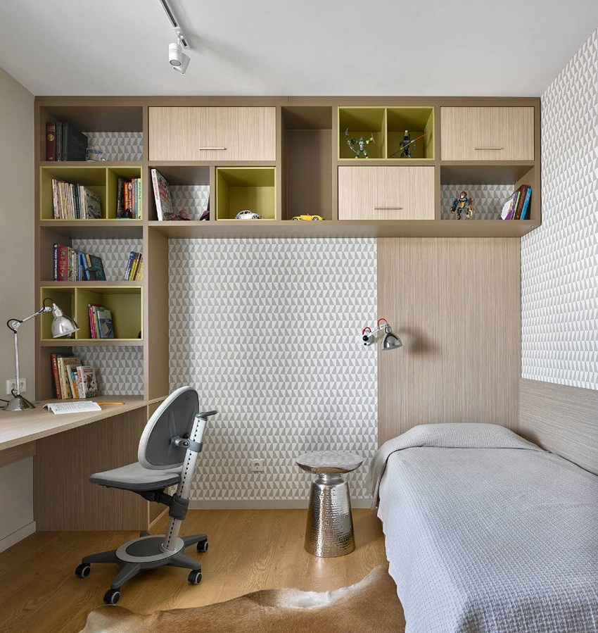 Eingebaute Verwandlungsbetten sind bei Teenagern beliebt, die mit Tischen, Schränken oder Klappmöbeln kombiniert werden. Einfach und benutzerfreundlich ist die Couch, die tagsüber zu einem Ort für die Aufnahme von Gästen wird und Platz für andere Möbelstücke schafft.