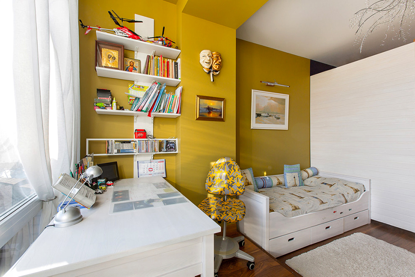 Das Alter von 7 bis 8 Jahren ist für ein Kind vorübergehend. Seine Freizeit verbringt er nicht nur mit Spielen. Eine lange Zeit des Tages ist mit Lernen beschäftigt. Daher ist es wichtig, einen vollwertigen, bequemen und komfortablen Ort für den Unterricht im Raum zu organisieren. Die optimale Option für kleine Räume ist ein Hochbett, das mit einem ausziehbaren Schreibtisch, Schubladen für Schulmaterial und Bücherregalen ausgestattet ist.
