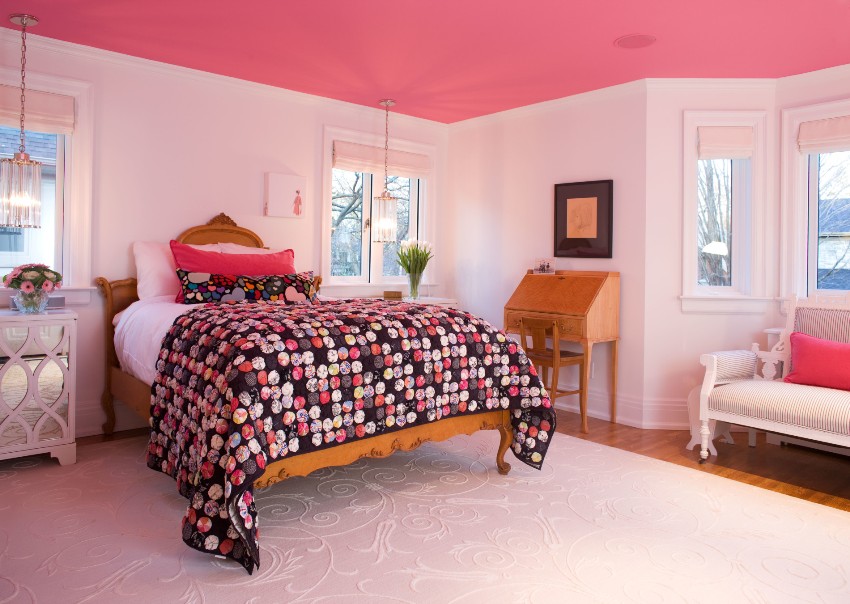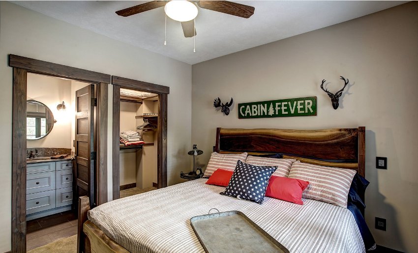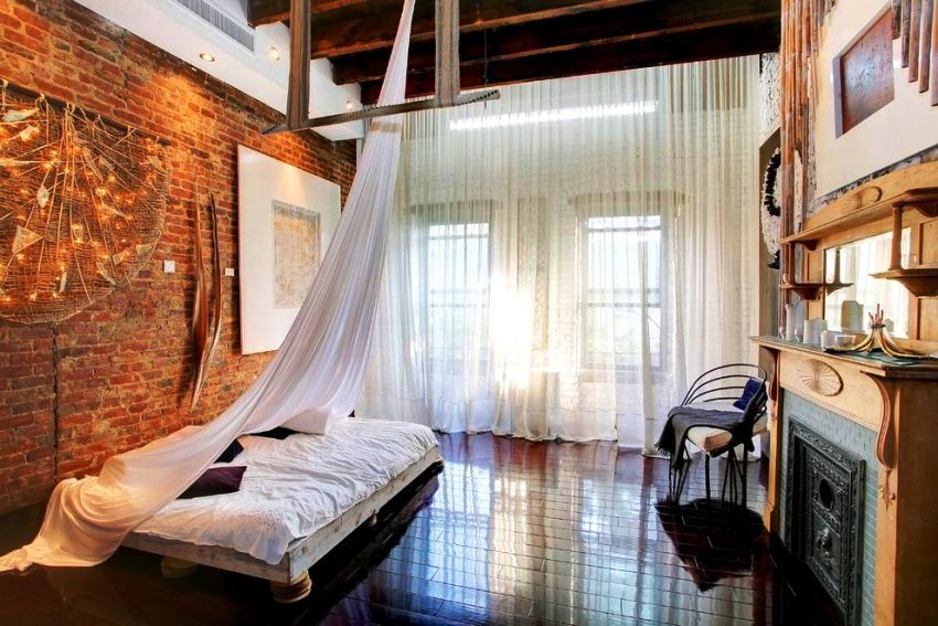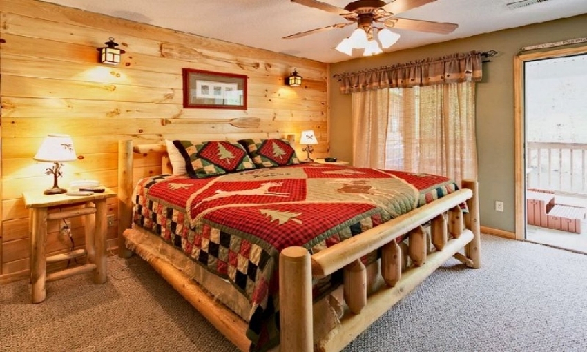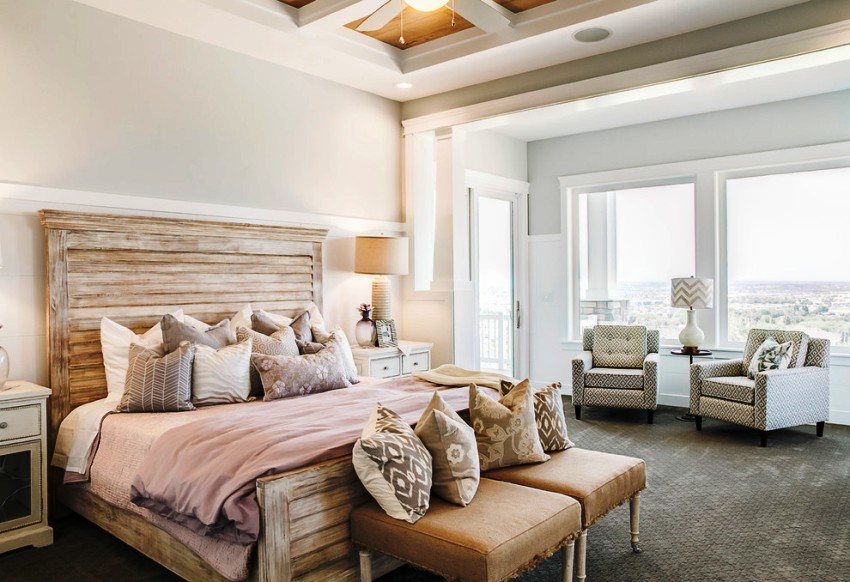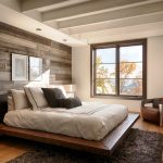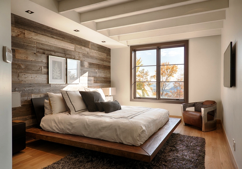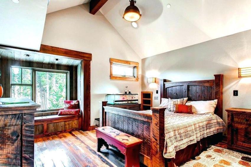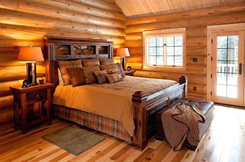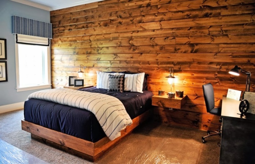 Der zweite Vorteil ist die Tatsache, dass das Kiefernholz selbst schön aussieht und in seiner ursprünglichen Form belassen werden kann. Sonnige Bernsteintöne füllen das Schlafzimmer mit einer angenehmen Farbpalette, machen es warm und gemütlich. Die natürliche Färbung von Kiefernbrettern ist unauffällig, und das reich verzierte Muster der Holzstruktur langweilt nicht und erfreut das Auge.