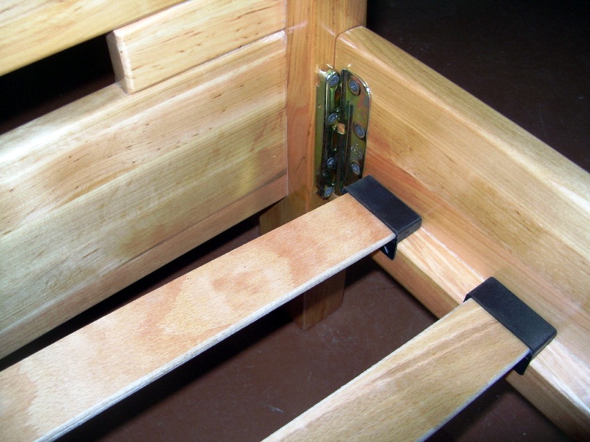 Alle vorgefertigten Komponenten des Rahmens sind mit einem Fleck bedeckt, nach dem Trocknen werden 2 Schichten schnelltrocknender Lack aufgetragen. Dann werden die Teile miteinander verbunden und Lamellen mit einer Mindeststufe von 2 bis 4 mm werden auf dem fertigen Rahmen aus Balken befestigt, auf den Sie dann die Matratze legen können, nachdem Sie zuvor sichergestellt haben, dass die Struktur nicht verschmutzt.