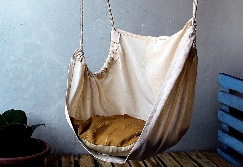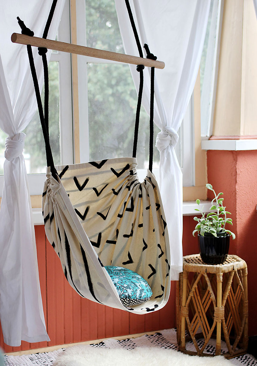 Textil. Preiswertes und erschwingliches Material, das einfach und leicht zu verarbeiten ist. Die Stärke des Endprodukts hängt von der Art und Qualität des gewählten Gewebes ab. Um einen Sessel herzustellen, können Sie entweder eine Leinwand aus altem, aber dichtem Denim verwenden, die mit Nieten oder Flecken verziert ist, oder einen Regenmantel oder eine Plane. Je natürlicher der Stoff ist, desto bequemer ist er beim Schaukeln: Wenn der Stoff nicht atmet, schwitzt die Haut im Sommer.