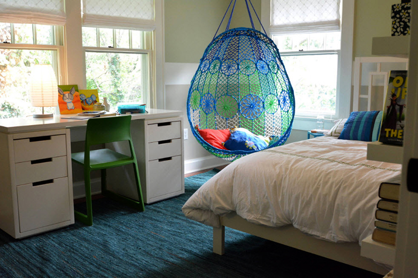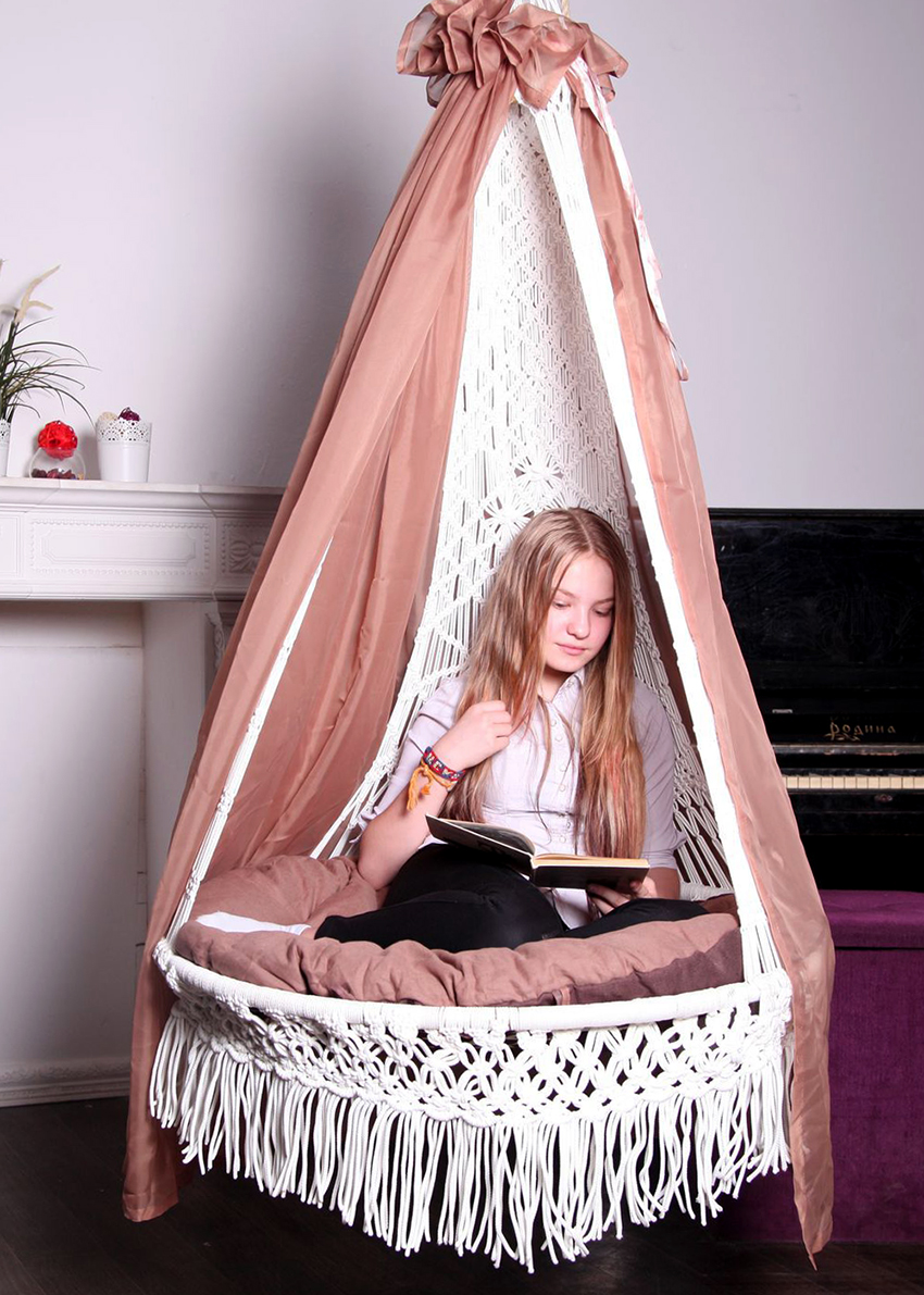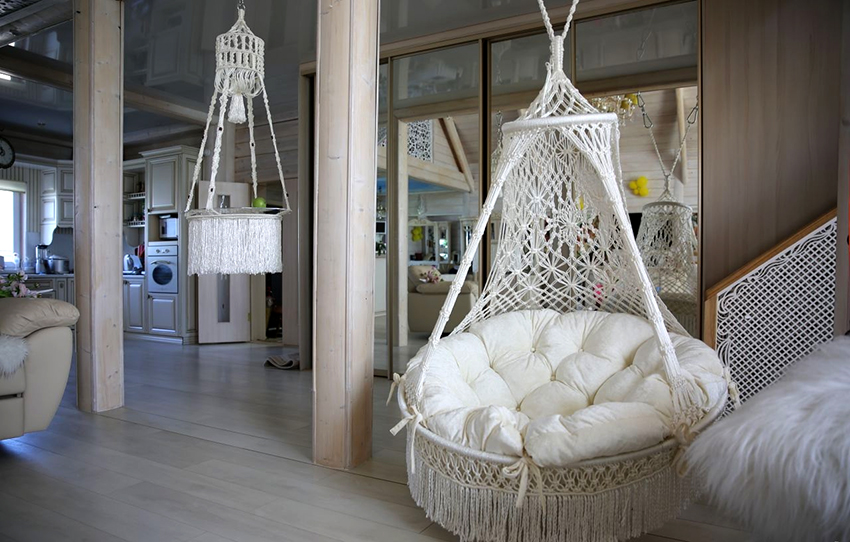 Ungewöhnliche Designmethoden, Formen und verschiedene Materialien ermöglichen es, handgefertigte Hängesessel an jede Raumgröße und jeden Stil anzupassen. Mit einem kompetenten Ansatz kann das fertige Produkt einem Gewicht von bis zu 200 kg standhalten, wodurch zwei Erwachsene oder ein Erwachsener mit einem Kind darin untergebracht werden können.