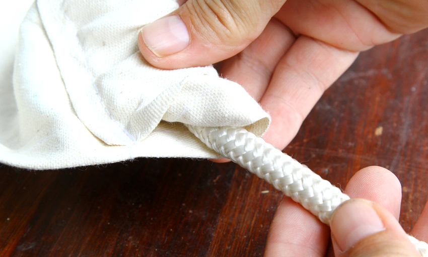Um Hohlräume zu erhalten, die zum Ziehen der Befestigungsschnur dienen, müssen 3 cm an zwei langen Seiten gebogen und entweder mit einer Schreibmaschine oder manuell genäht werden.