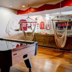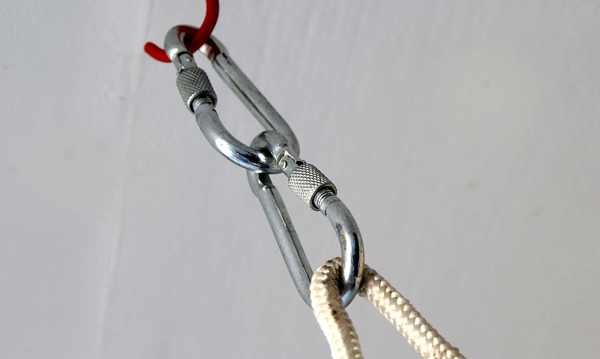 Lange hängende Schnurlängen werden durch spezielle Löcher im Stoff und durch gebohrte Löcher geführt und auch an der Basis der Stange befestigt. An dem Haken, der mit Hilfe von Ankern im Voraus fest an der Decke befestigt ist, wird zuerst ein und dann der zweite ovale Stahlkarabiner installiert, in den die Schwenkschlaufe geworfen wird. Dies gewährleistet eine hohe Qualität und ein sicheres Skifahren.