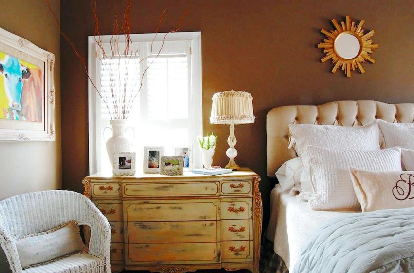 - Holzmöbel unterstreichen die Innenausstattung des Schlafzimmers im Landhausstil. Auch in diesem Fall ist ein Nachttisch aus Öko-Leder oder Stoff geeignet.