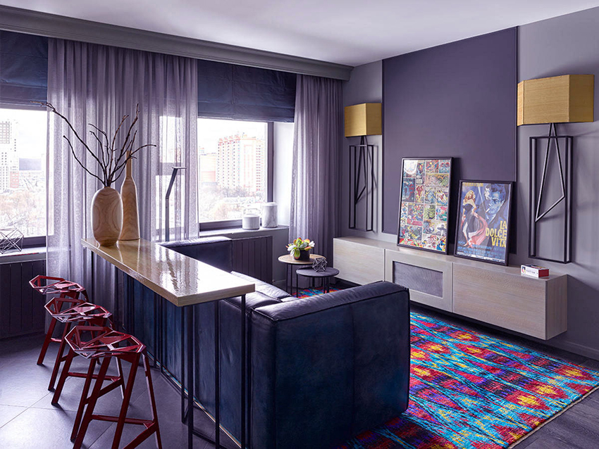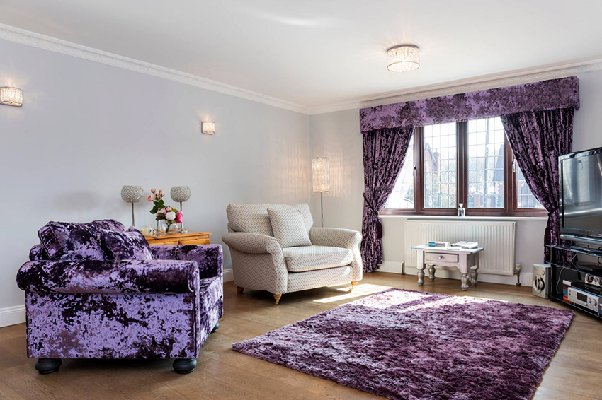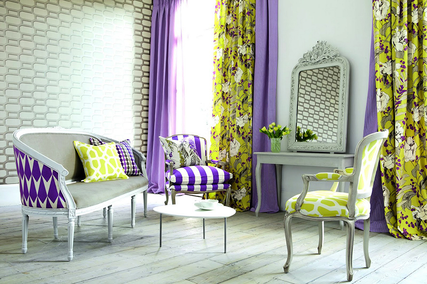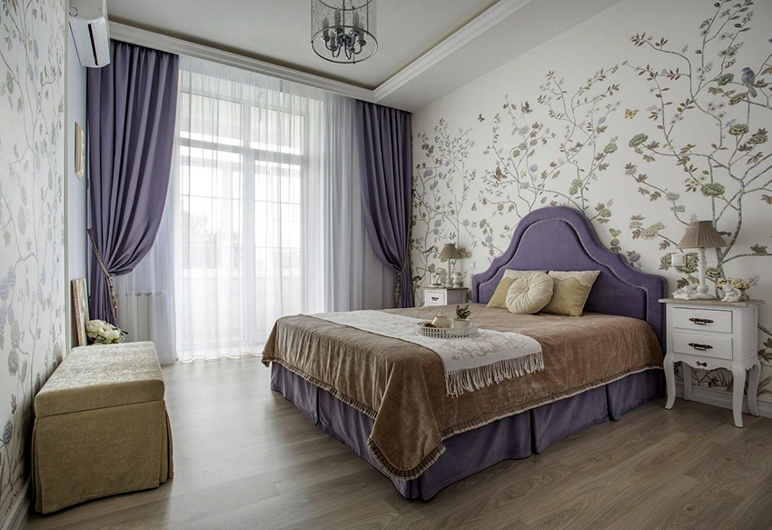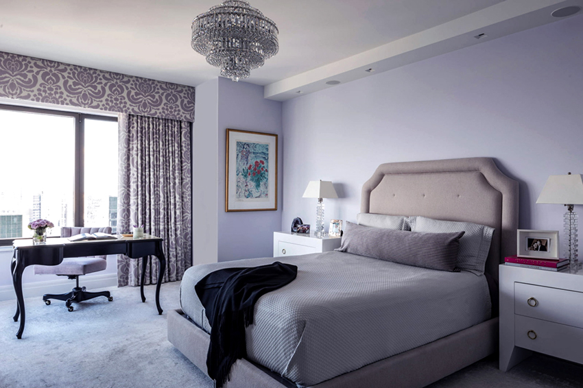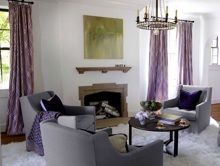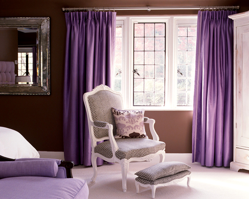 - Lavendel. Eine sanfte Universalfarbe, die sich für die Gestaltung von Vorhangdesigns in einem Raum jeden Stils eignet.