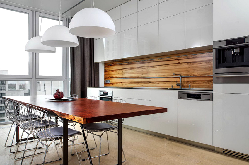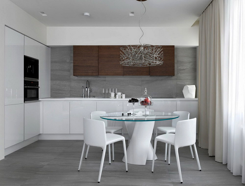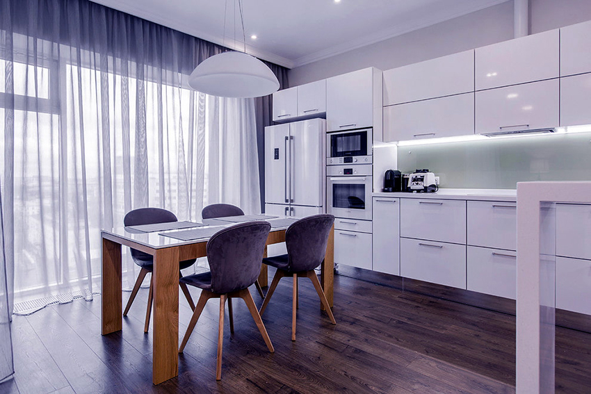 Bei der Auswahl der Küchenvorhänge müssen Sie zunächst die Besonderheiten des Raumes berücksichtigen. Wenn der Raum oft gekocht wird und sich die Gäste hier zum gemeinsamen Abendessen versammeln, können Verschmutzung und ständige Gerüche im Raum nicht vermieden werden. Daher ist es besser, synthetische Lichtvorhänge mit einer schmutzabweisenden Beschichtung zu wählen, die leicht zu waschen sind. Die wichtigsten Arten von Vorhängen in der Küche sind: