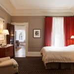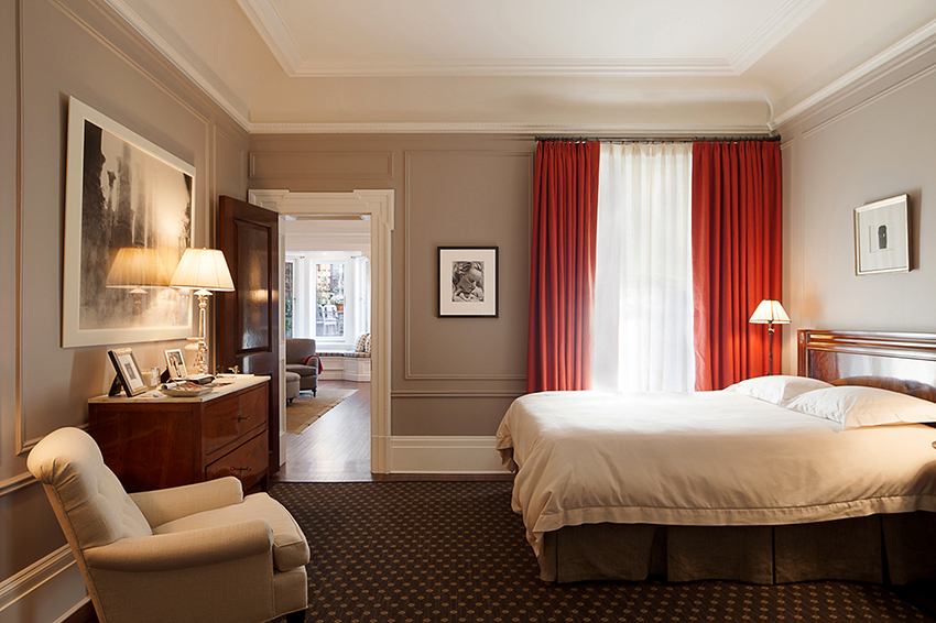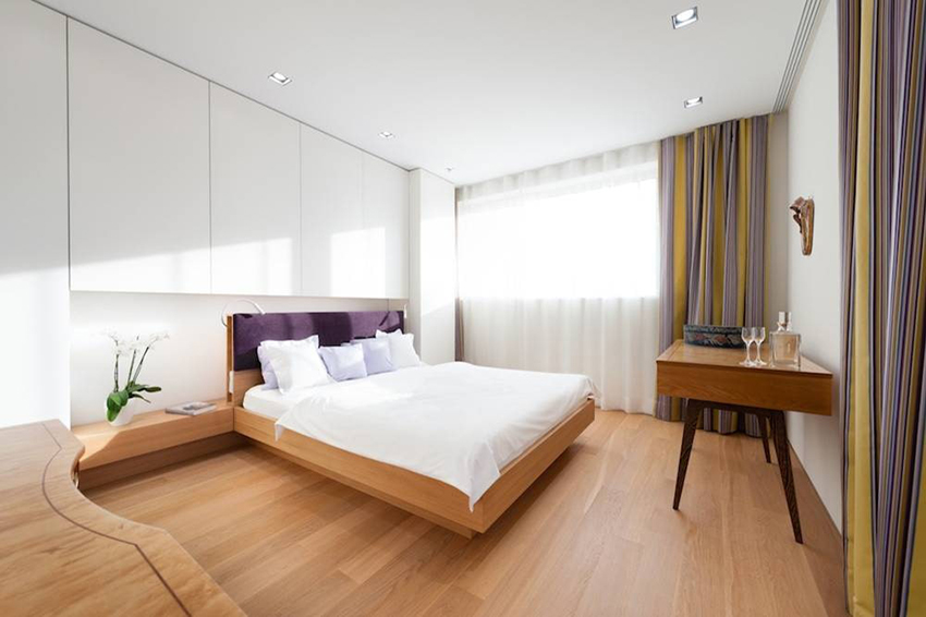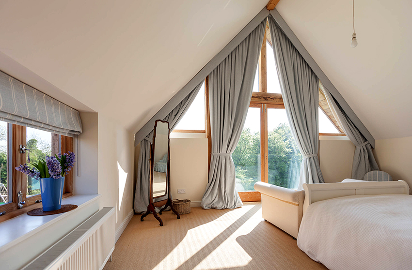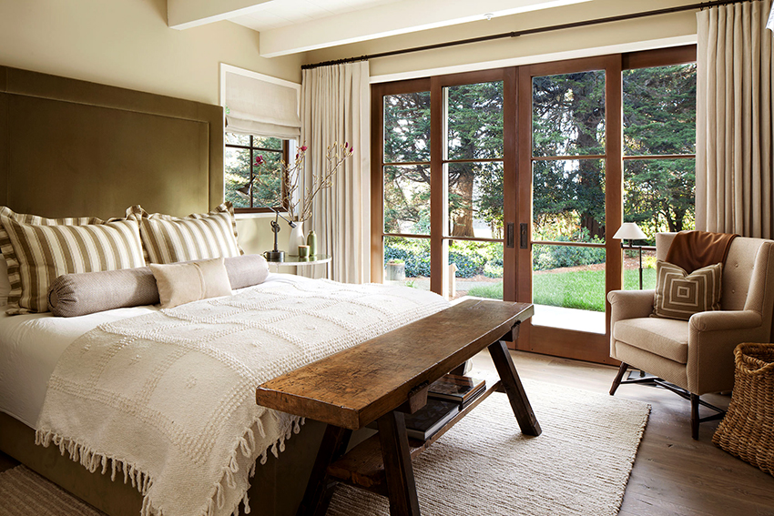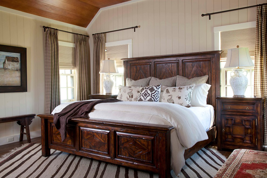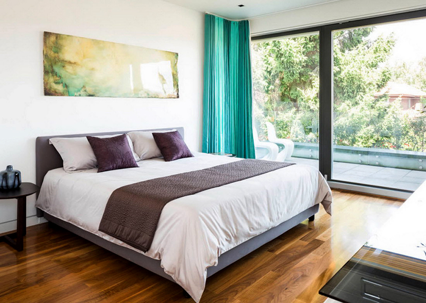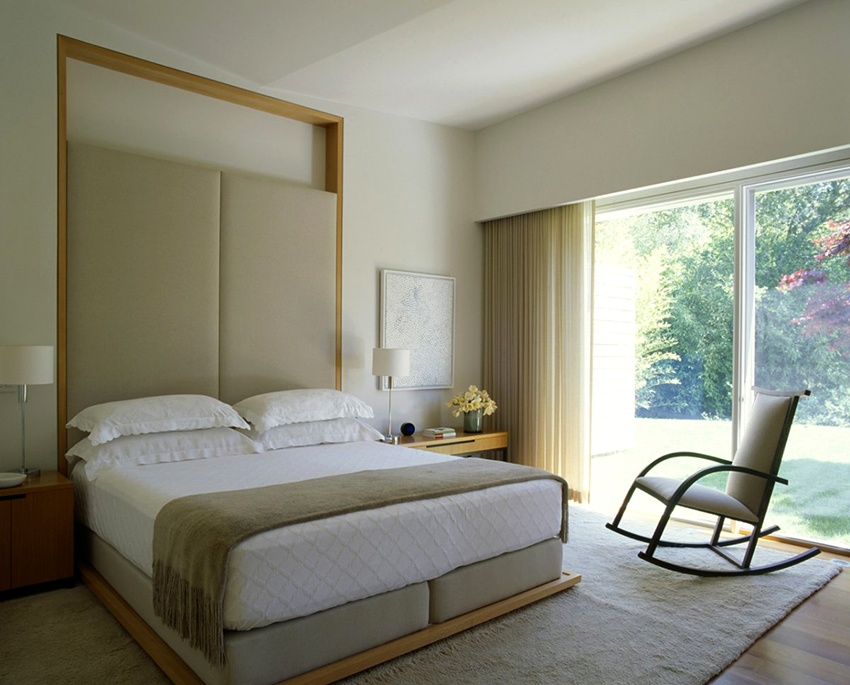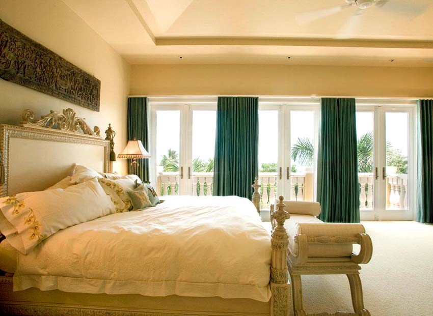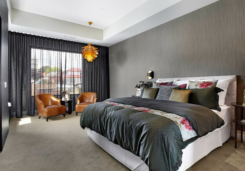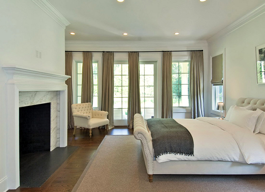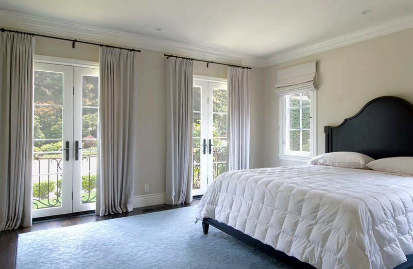 In einem großen Schlafzimmer können Sie Vorhänge in jedem Design und Volumen auswählen. Hauptsache, sie fügen sich harmonisch in das umgebende Interieur ein. Bei der Auswahl einer Farbe werden helle und natürliche Farbtöne bevorzugt, die beruhigend wirken. Die Vorhänge im Schlafzimmer in Farbe und Muster können zum Design der Bettwäsche passen.
