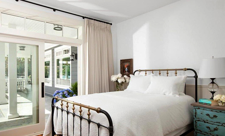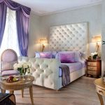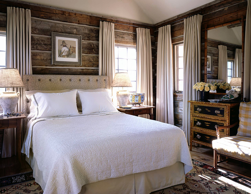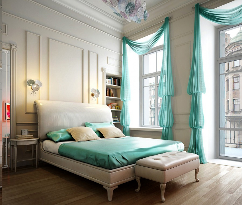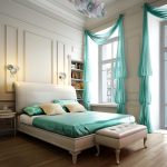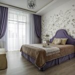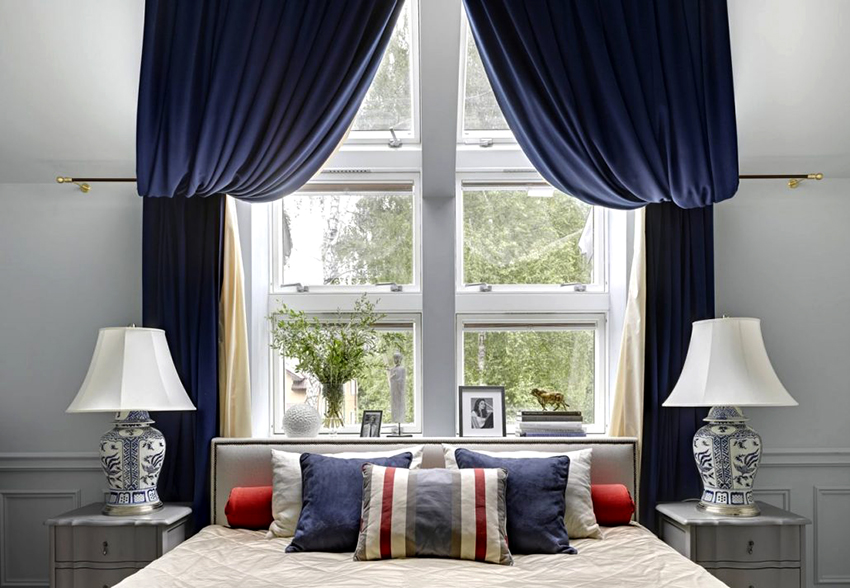 Ein wichtiger Punkt ist die Auswahl des Materials für Vorhänge im Schlafzimmer. Hier ist es besser, natürlichen oder im Extremfall kombinierten Stoffen den Vorzug zu geben, die gut drapieren und ihre Form behalten. Wenn Verdunkelungsvorhänge gewählt wurden, wird empfohlen, sie mit hellem Tüll zu kombinieren, der tagsüber den Raum etwas verdunkeln kann. Immer seltener finden Sie im Schlafzimmer die Klassiker der Vorhänge, die mit einem Lambrequin oder voluminösen Rüschen verziert sind. Solche Optionen werden normalerweise nur in großen Häusern verwendet, in denen das Schlafzimmer im klassischen Stil wie Barock, Jugendstil oder Empire gestaltet ist.