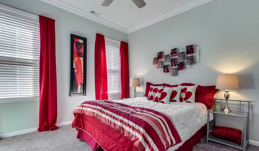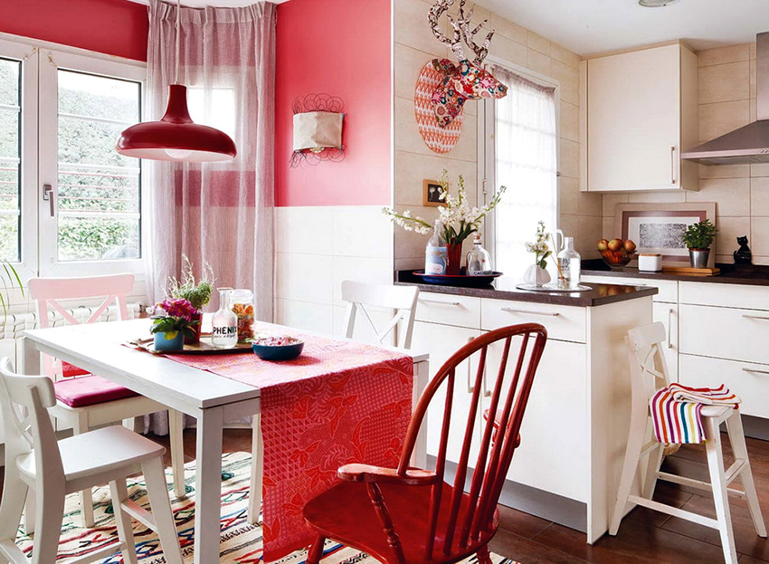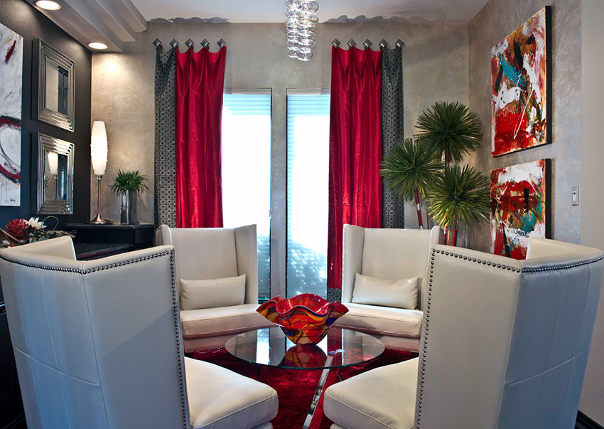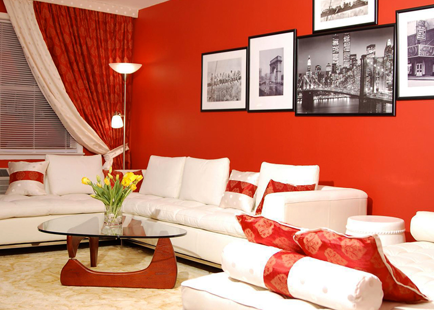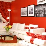 - Rot. Eine energiegeladene Farbe, die zu mutigen Innenräumen passt. Es ist erforderlich, es in der Dosierung zu verwenden. Sie sollten keine übermäßig hellen Optionen wählen, die mit der Zeit irritieren.