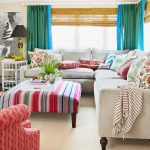 - Wenn Sie die Aufmerksamkeit auf das Fenster lenken möchten, können Sie helle Vorhänge aufhängen, die mit einem Käfig oder Streifen verziert sind.