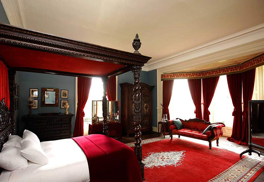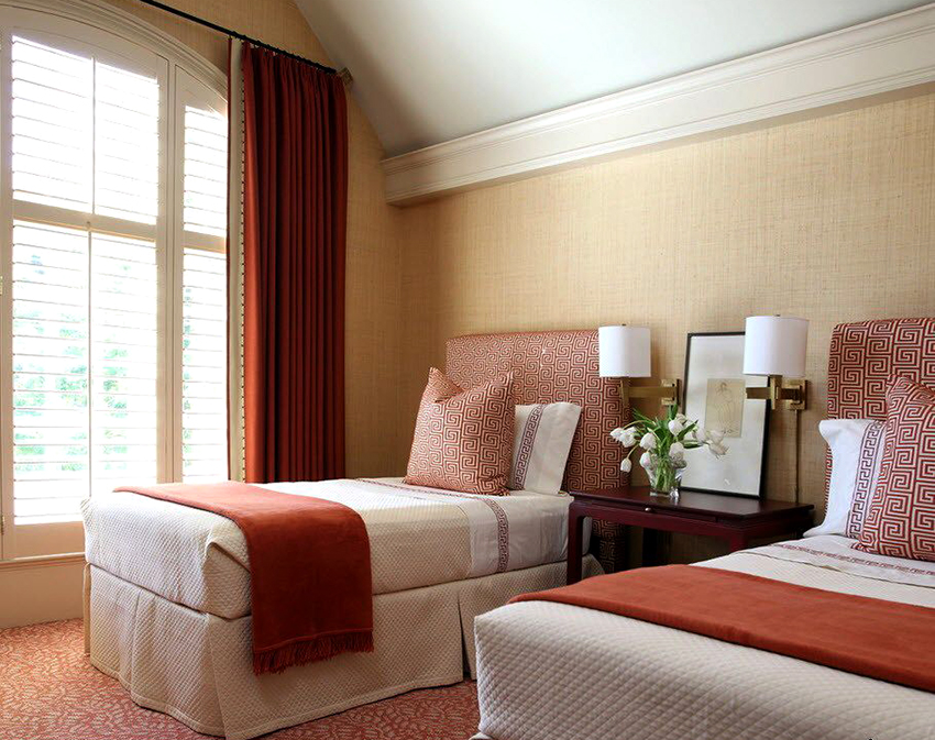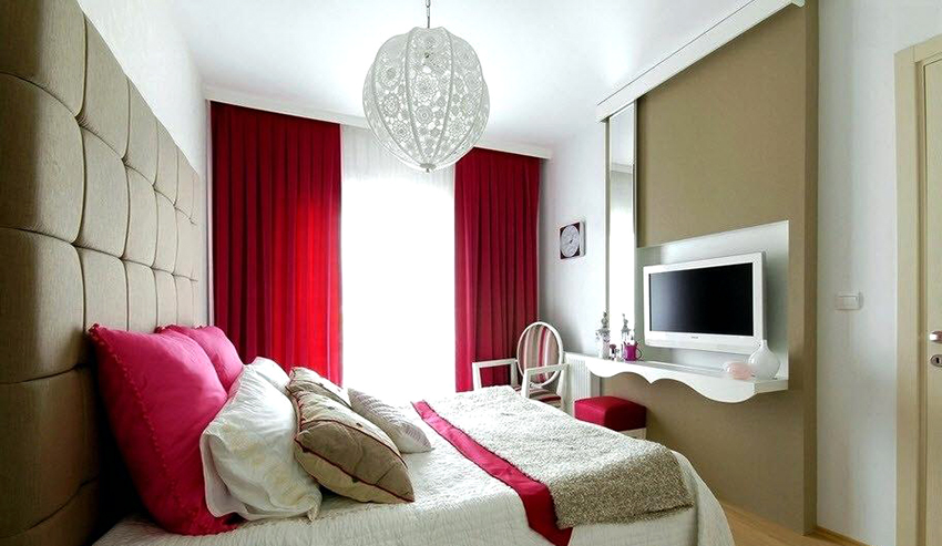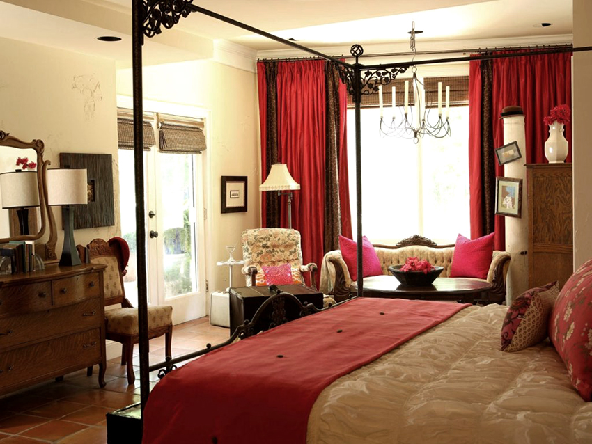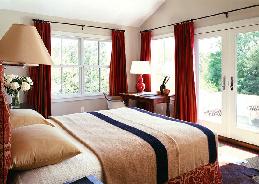 - Burgund. Bezieht sich auf ruhige Rottöne. Voluminöse burgunderfarbene Vorhänge aus dichtem Stoff machen das Schlafzimmer wirklich romantisch.