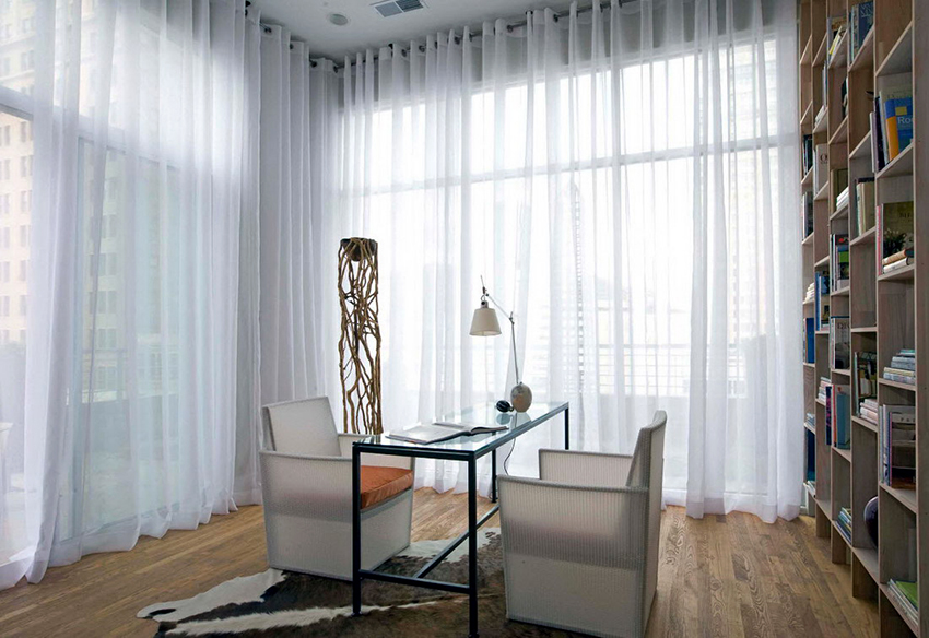- Organza. Ein Mischgewebe aus Baumwolle und Rayon. Auf dem Foto sieht der Organza schwerelos und lakonisch aus. Organza-Vorhänge können als eigenständiges Element verwendet werden oder als zusätzliches Dekor in Kombination mit Roman, Rollläden oder Jalousien dienen.