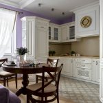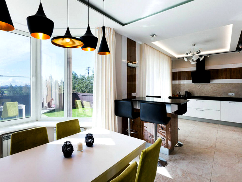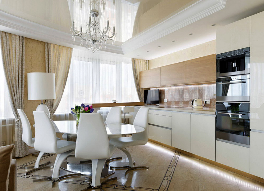 - Weiß. Eine weitere vielseitige Farbe, die in jedes Interieur passt. Weiße Vorhänge an der Decke können die Höhe der Wände optisch erhöhen. Aufgrund der Verschmutzung wird diese Option jedoch nicht für die Verwendung in der Küche empfohlen.