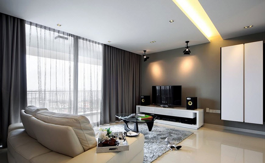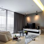 - Hightech. Auf dem Foto von Vorhängen im Wohnzimmer in einem modernen Stil sind achromatische Leinwände in Silberfarbe häufiger. Ein Vorteil ist das Vorhandensein eines Bedienfelds, mit dem Sie die Position der Vorhänge einstellen können.