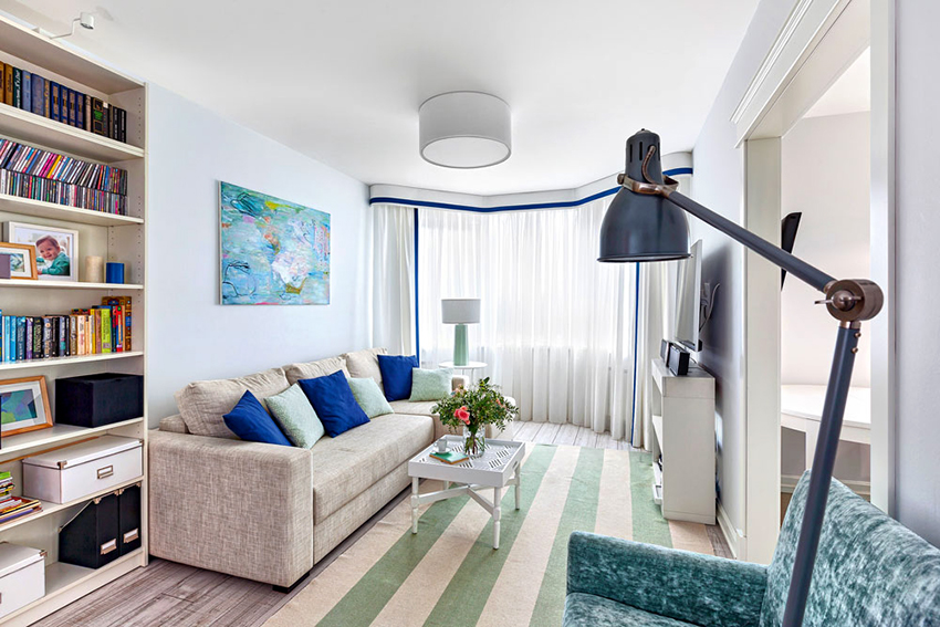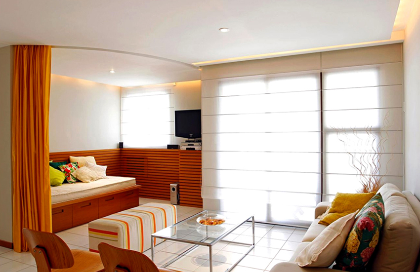- In einem kleinen Raum wird empfohlen, mehrere Schichten durchscheinender Produkte in verschiedenen Farbtönen zu befestigen, um die Wirkung dicker Vorhänge zu erzielen.