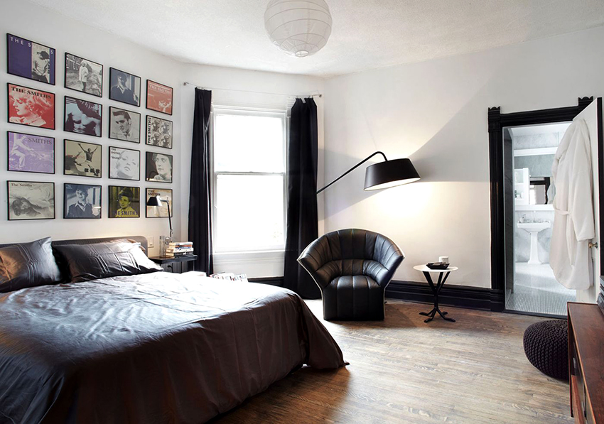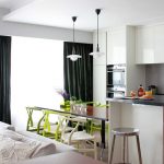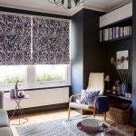 - Das monochrome Interieur wird erfolgreich durch schwarz-weiße Vorhänge mit Schachbrettmuster oder eine Art abstrakten Druck ergänzt.Diese Option ist eine gute Ergänzung für Innenräume im modernen minimalistischen Stil.