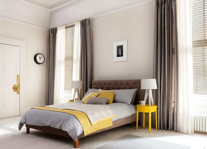 Hilfreicher Tipp! Wenn massive mehrschichtige Vorhänge verwendet werden, muss mindestens eine der Schichten zum Schatten der Wände oder Möbel passen - der Rest kann geringfügig abweichen.