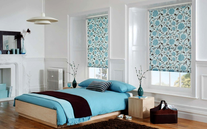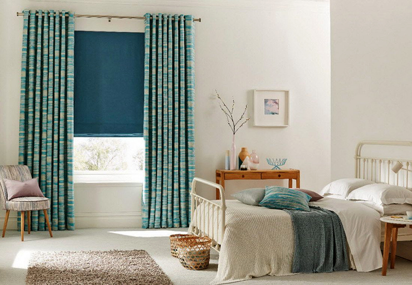 In einem kleinen Schlafzimmer ist es unerwünscht, zu massive Vorhänge aufzuhängen, wodurch die Fläche eines bereits kleinen Raums optisch verkleinert wird. Wenn der Raum reichlich beleuchtet ist oder sich im Erdgeschoss befindet, können Sie kombinierte Optionen verwenden. Zum Beispiel können Rollläden oder Raffrollos direkt in der Fensterebene platziert werden, und es wird empfohlen, leichte und schöne Organzavorhänge darüber zu befestigen.