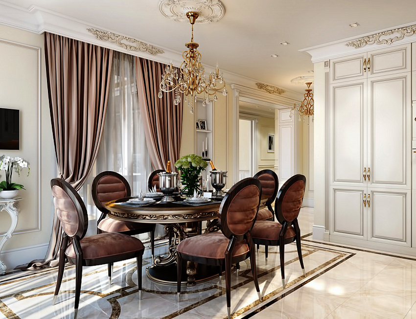 - Empire-Stil. Vorhänge sollten reichlich drapiert und mit Lambrequins dekoriert sein. Hauptsächlich werden Seide, Fransen und Samt verwendet.