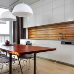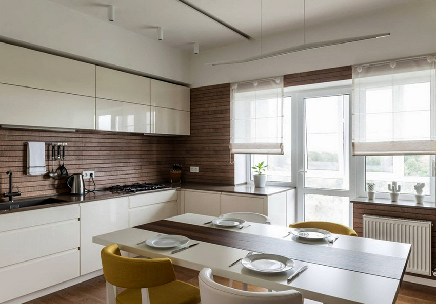 - Kombiniert. Wenn es sich um ein modernes Design von Vorhängen für eine Küche mit Balkontür handelt, können Sie Produkte unterschiedlicher Länge verwenden: Ein kurzer Vorhang bedeckt den Fensterbereich und ein langer hängt an der Ebene der Balkontür. Die beste Option sind Rollläden, römische oder österreichische Vorhänge, die unter dem Einfluss eines Luftzuges nicht auseinander fliegen.