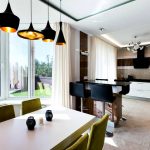- Wenn Sie für hohe Decken die Aufmerksamkeit von der Decke ablenken möchten, werden Vorhänge mit volumetrischen abstrakten Bildern ausgewählt.