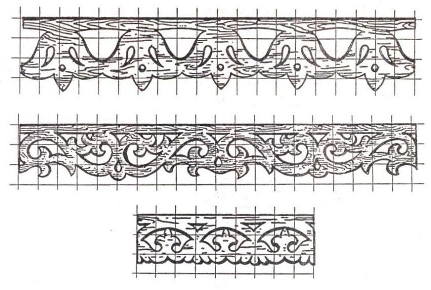 - Nach Skizzen (Bilder, Vorlagen) von geschnitzten Holzplatten werden an den Fenstern Rohlinge ausgeschnitten. Dies geschieht am besten mit speziellen Tischlerwerkzeugen.