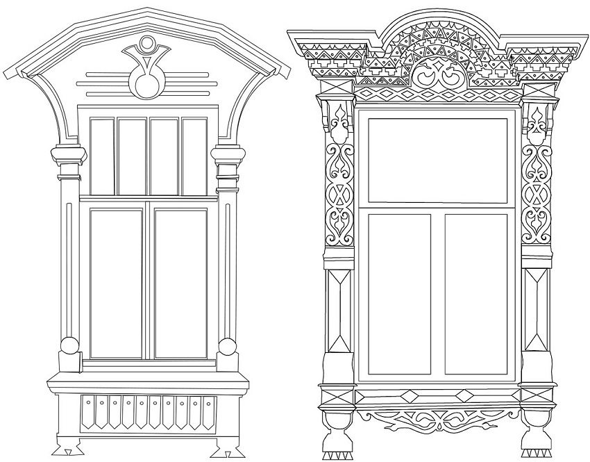 - betont den ursprünglichen Stil des Gebäudes und ermöglicht es Ihnen, alle Gebäude auf dem Gelände in einem architektonischen Ensemble zu kombinieren. Wenn wir die Muster auf den Fensterrahmen aller Gebäude gleich machen, entsteht der Eindruck einer vollständigen Komposition.