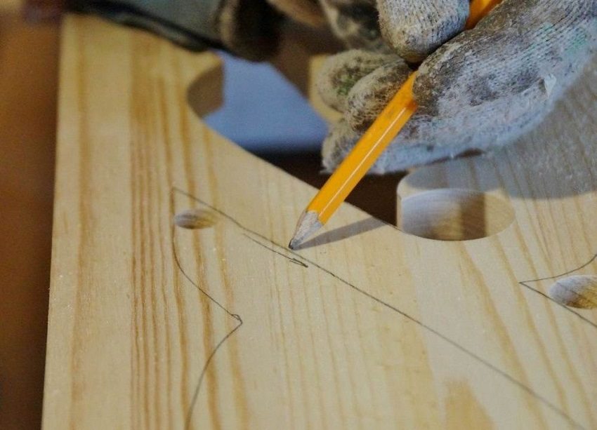 - Das Muster, das gemäß der Schablone auf die Platte aufgebracht wird, wird mit einer Stichsäge und Bohrern mit verschiedenen Durchmessern ausgeschnitten.