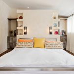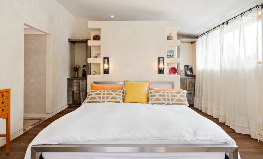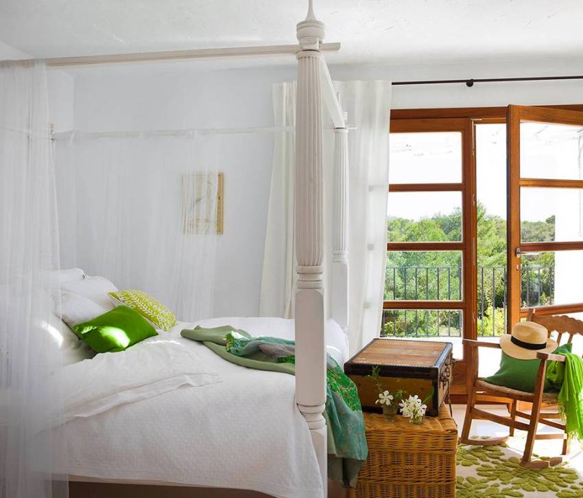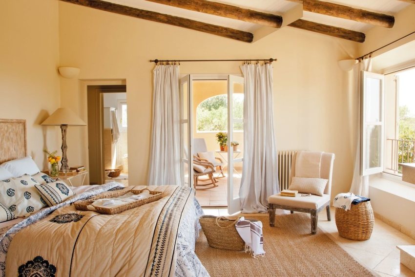 Hilfreicher Tipp! In einem traditionellen mediterranen Schlafzimmer sollten Möbel auf ein Minimum beschränkt werden. Daher ist es notwendig, dass es nur die notwendigsten Möbelstücke enthält: ein Bett, einen Nachttisch, einen Kleiderschrank.