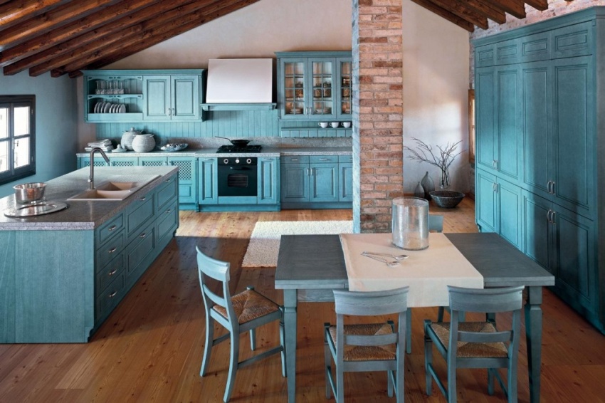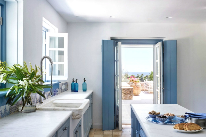 Der mediterrane Stil im Inneren der Küche impliziert Assoziationen mit dem Meer und Entspannung