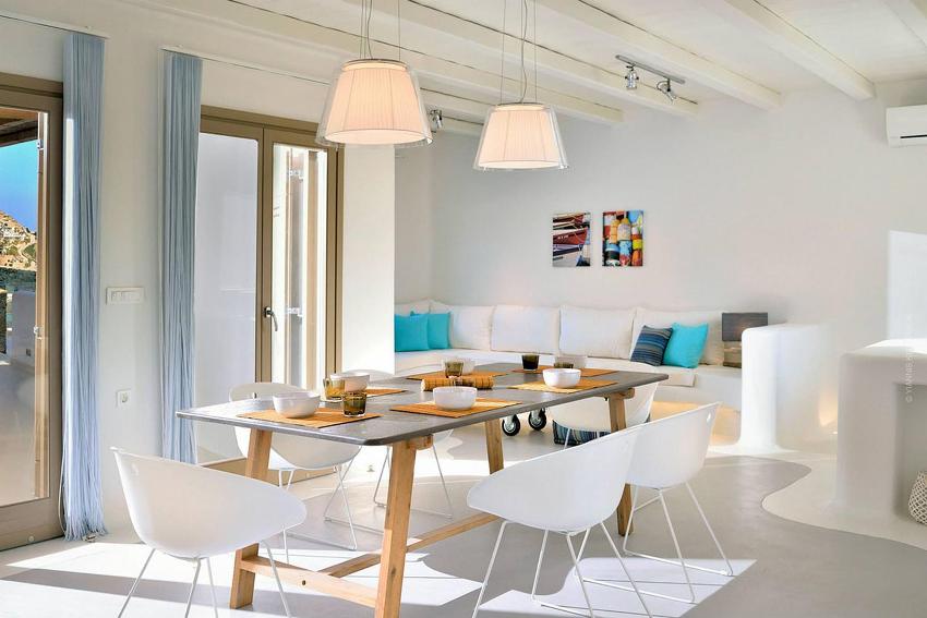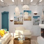 Bei der Gestaltung einer Wohnung im mediterranen Stil ist es sehr wichtig, Raum und viel Licht zu schaffen: sowohl natürlich als auch künstlich. Die Gestaltungsmöglichkeiten sind auf dem Foto der Innenräume im griechischen Stil zu sehen.