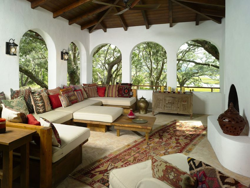 Es gibt arabische Einflüsse in den bogenförmigen Fenstern und Türen, glatten weißen Wänden und Keramik im orientalischen Stil. Auch die Verwendung von Keramikfliesen mit arabischen Motiven in der Küche und sogar im Bad ist typisch für die marokkanische Ausrichtung des mediterranen Stils. Darüber hinaus kann es in Schlafräumen gesehen werden.