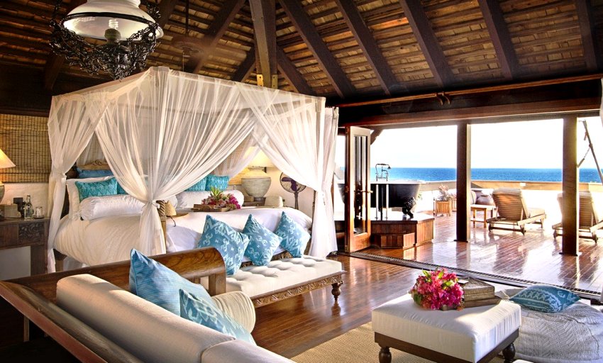 Ein Baldachin über einem großen Bett und helle Vorhänge verleihen einem Raum im mediterranen Stil Luftigkeit